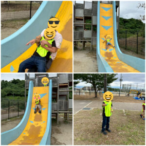 彩都なないろ公園には巨大滑り台があって頑張って滑る児童や